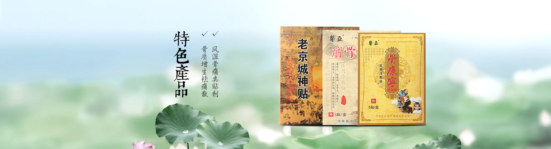 公司主要從事貼劑、膏藥、粉劑及醫(yī)療衛(wèi)生材料等多種劑型生產(chǎn)銷售。主導(dǎo)產(chǎn)品有:骨質(zhì)增生袪痛貼、肩周炎一貼靈、安痛貼[系列]、偏癱威靈貼、腳氣百分百、兩面針抗菌液、痛經(jīng)百消貼、乳腺增生百消貼、無痕燒傷膏、等二十多個產(chǎn)品。